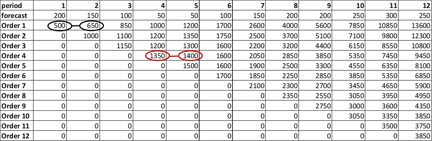 - Look at all past orders (t=1 .. N) and find the cost for ordering for D(t) by adding the quantity to past orders D(t-1)