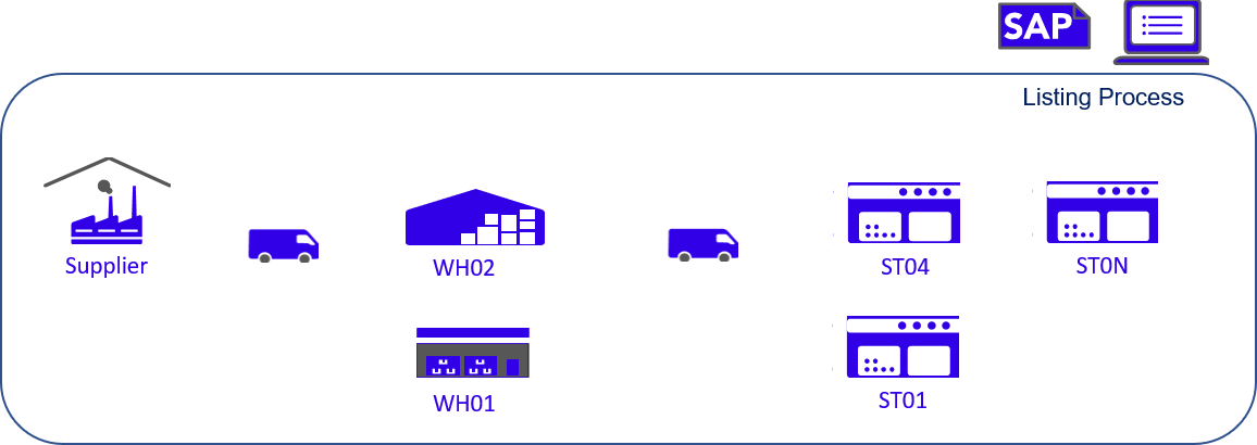 Example: SAP is used by your Retail Company with a scope including 20 stores named {ST01, ST02, … ST20}. These stores are delivered by Trucks from two Distribution Centers (DC) named {WH01, WH02}.