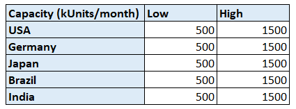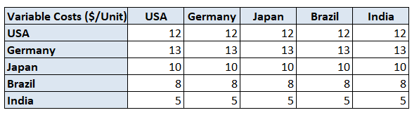 For instance, the variable cost of a unit produced in Germany is 13$/Unit.