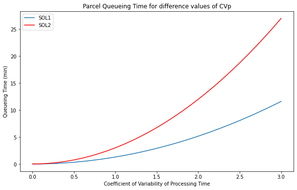 - When we bring variability in the processing time (number of items per parcel to check, picking errors, quality issues we see that solution 1 outperforms solution 2.