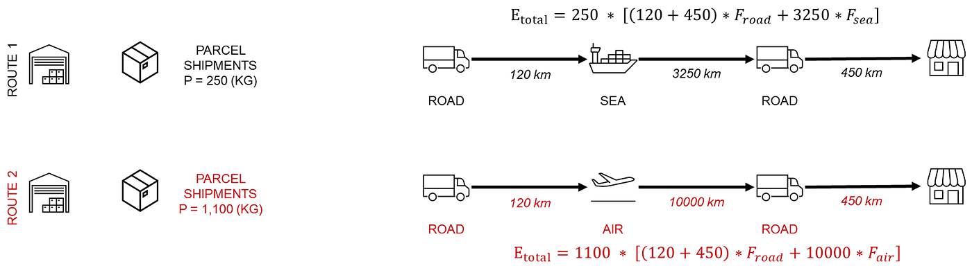 A more accurate approach would be to estimate each delivery's CO2 emissions, accounting for the vehicle type (truck, container ship, plane, or train) and the load factor.