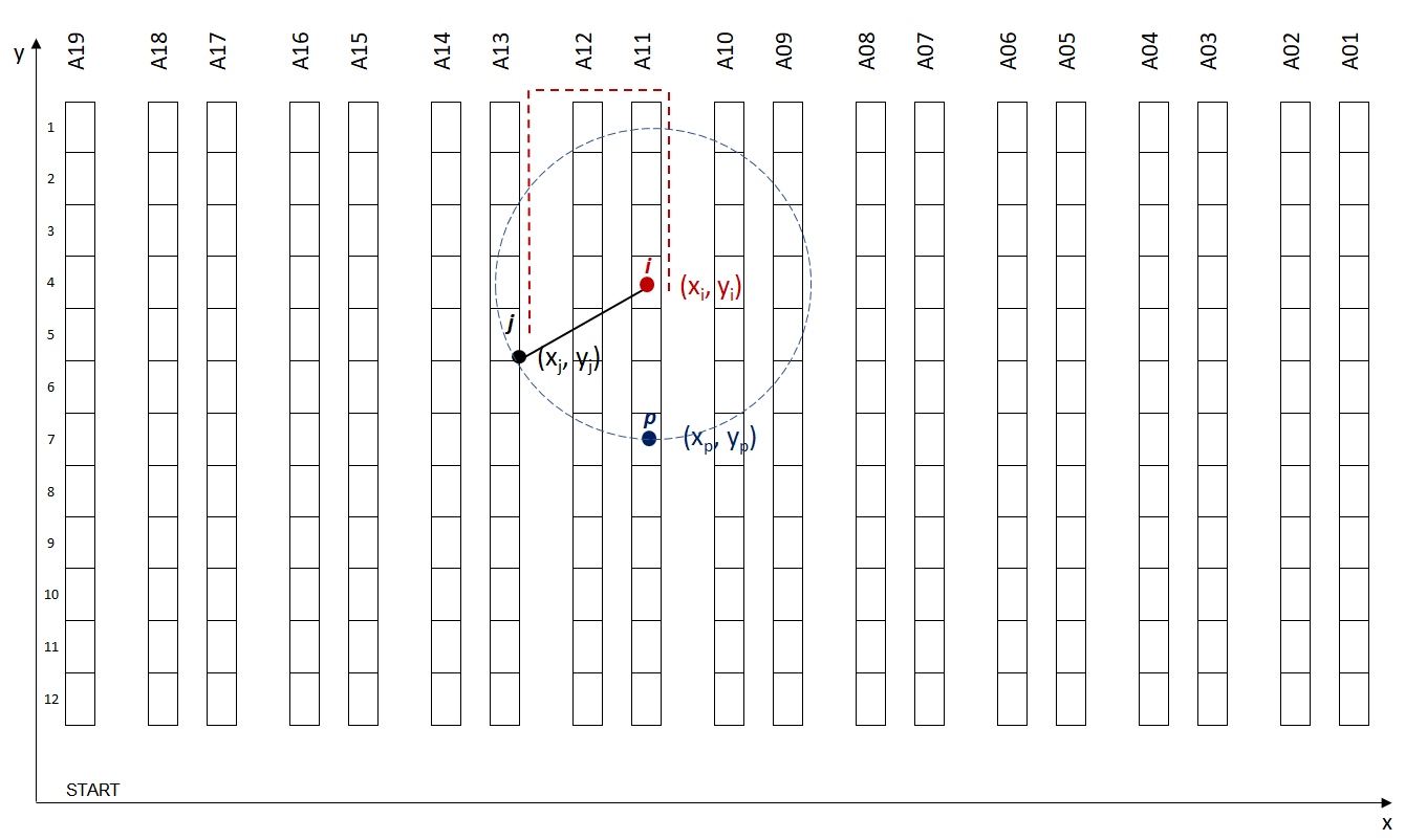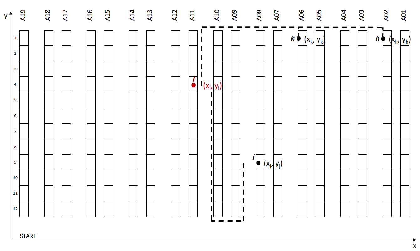 Based on the actual warehouse layout, storage locations are mapped with 2-D (x, y) coordinates that will be used to measure walking distance.