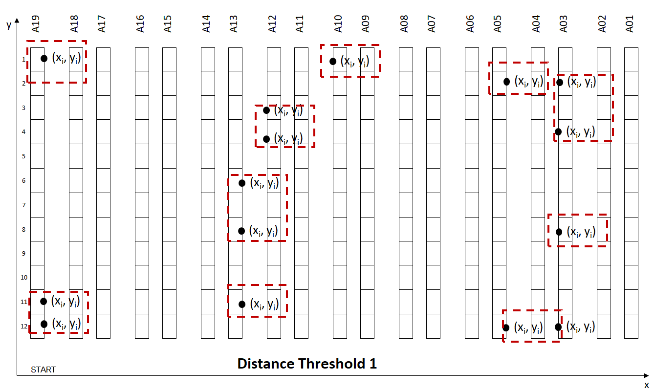 - Distance Threshold: Maximum distance between two picking locations (distance_threshold = 35 m)