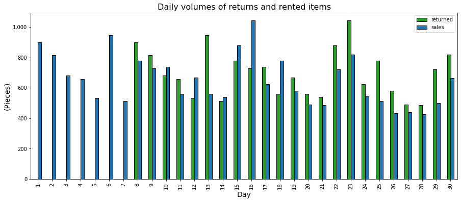 When rental sales peak (like on day 16), we observe the same peak in returns seven days later (day 23).