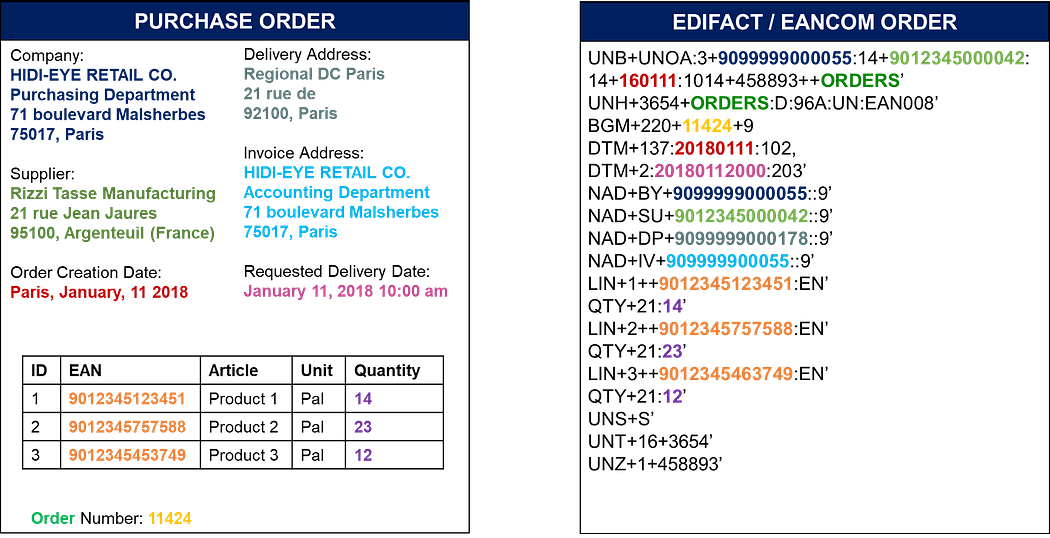 In the example above, a purchase order is translated into an EDI message for transmission.