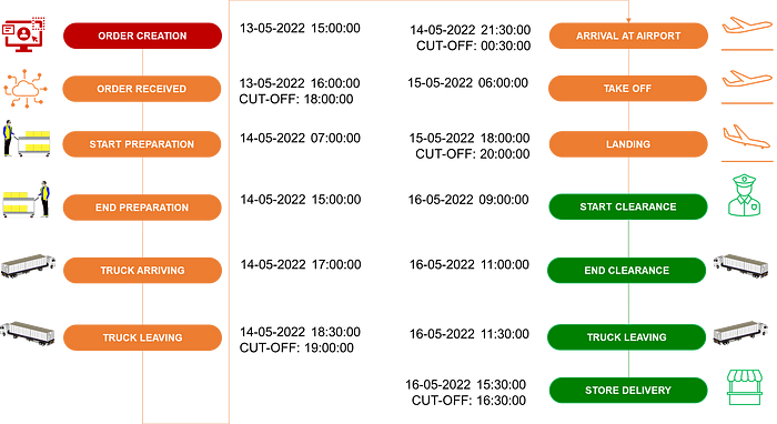 - Each event is linked with a time stamp (from Order Creation to Store Delivery)