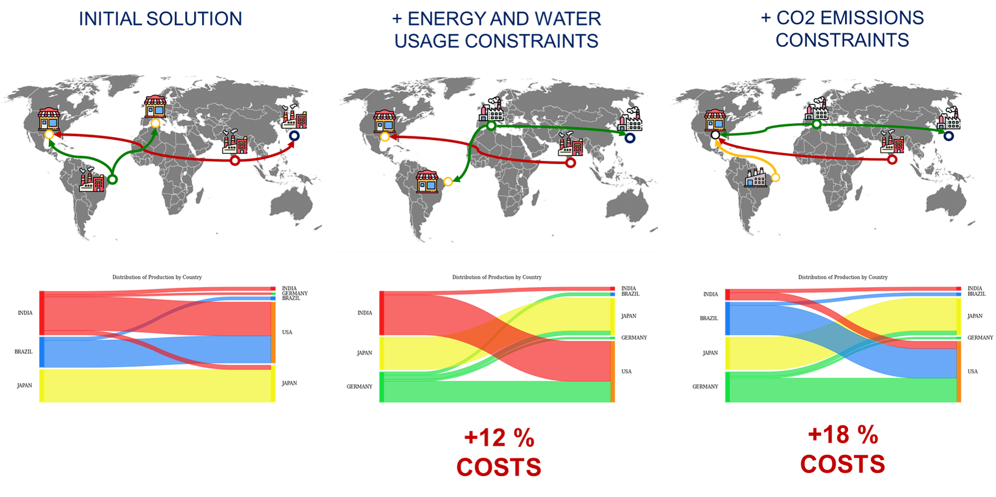 In our example, we can see that CO2 emissions constraints can lead to a localization (quasi-localization) of the production to reduce the impact of transportation.